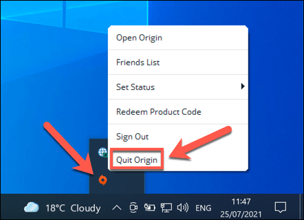 - Re-open Origin once you’ve closed the client fully by selecting the **Start menu **> **Origin** (or **Start menu **> **EA Desktop** for EA Desktop users). Ensure that it isn’t running first by checking your system tray in the bottom-right area of the taskbar. If it is, right-click the icon and select **Quit Origin **(or **Exit**).