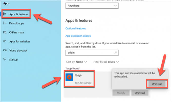 - In the **Settings** menu, select **Apps **> **Apps & features**. Locate **Origin** or **EA Desktop** in the apps list, then select **Uninstall** > **Uninstall** to remove it.