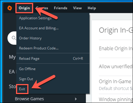 - Once automatic updates are enabled, quit Origin by selecting **Origin **> **Exit**. EA Desktop users can select the top-left **menu icon** > **Exit **instead.