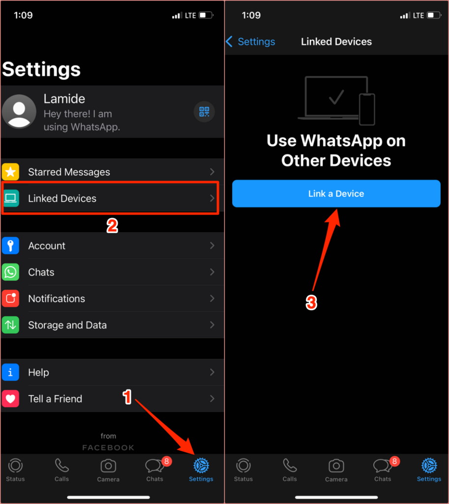 For iOS devices, launch WhatsApp, go to Settings > Linked Devices and tap Link a Device.