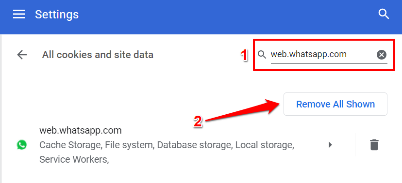 For Chrome, go to Settings > Privacy and security > Cookies and other site data > See all cookies and site data. Type “web.whatsapp.com” or “whatsapp.com” in the search bar and tap the Bin icon or select Remove All Shown to delete all cookies relating to WhatsApp Web or WhatsApp itself.