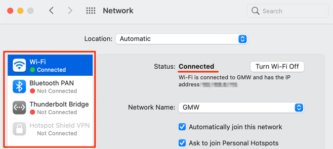 For macOS-powered desktops and notebooks, head to System Preferences > Network and check the connection status for the network categories on the left sidebar.