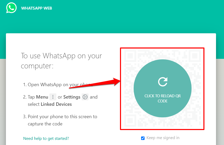 Note that the QR code changes after 20 seconds. Plus, there’s a timeout period for connecting to WhatsApp Web. If you don’t scan any QR code within two minutes, you’ll have to reload the page or select Click to Reload QR code on the screen to bring up new QR codes.
