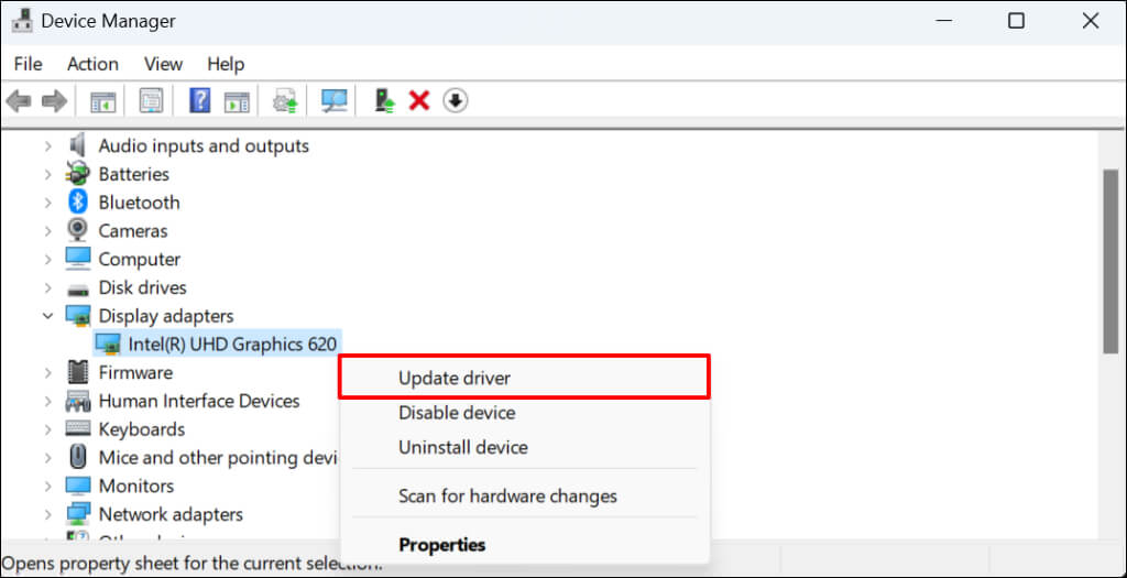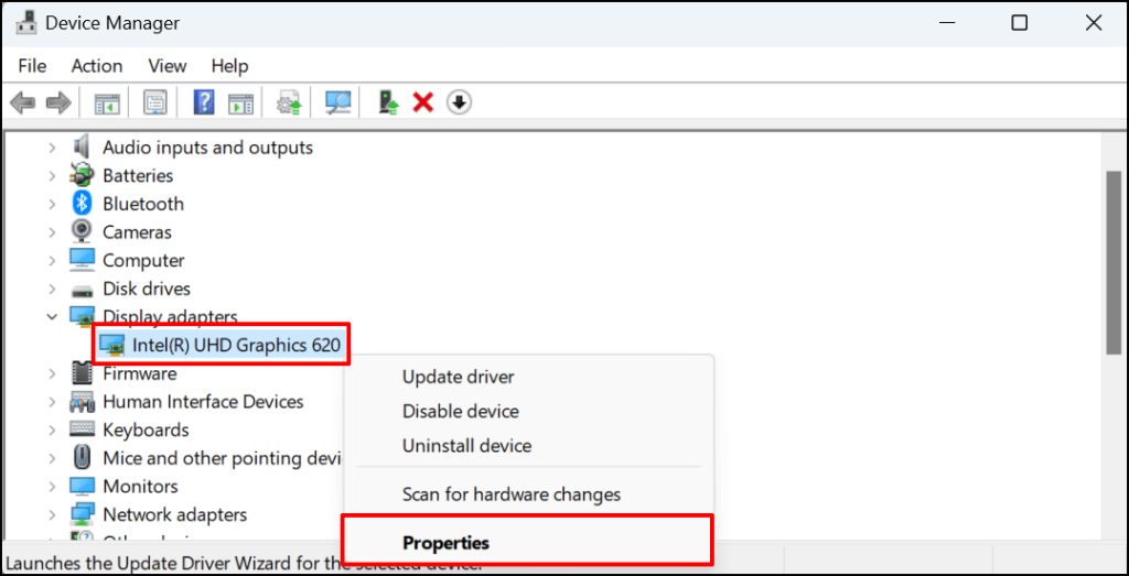 - To roll back your display driver to a previous or stable version, right-click the driver and select Properties.