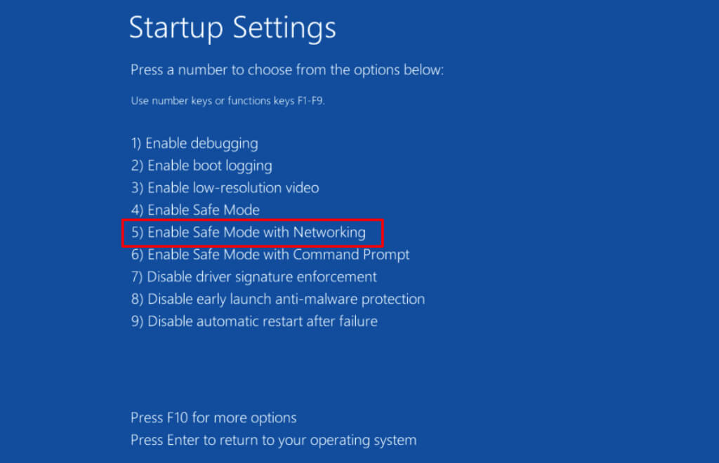 - Press 5 or F5 on your keyboard to Enable Safe Mode with Networking.