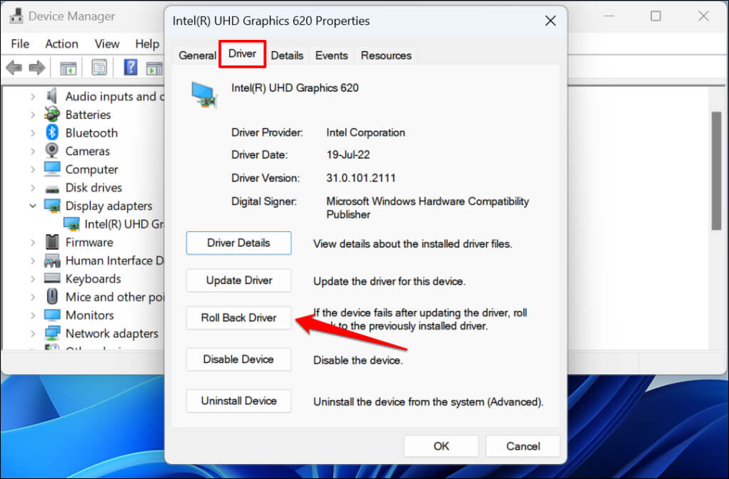 - Head to the “Driver” tab and select Roll Back Driver.
