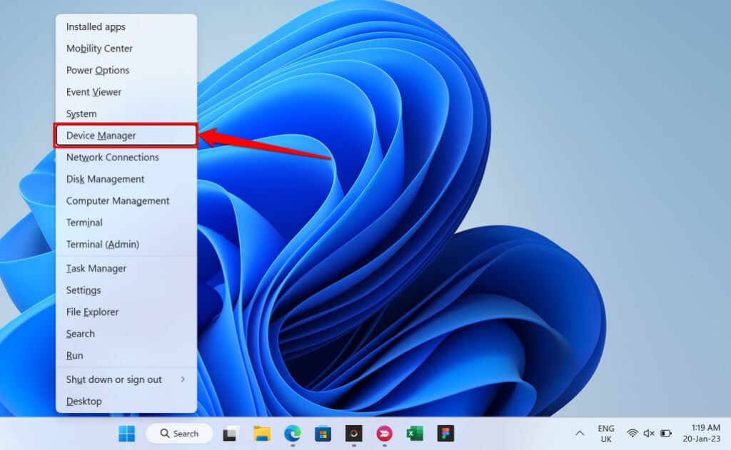 - Right-click the Start menu or press Windows key + X and select Device Manager.