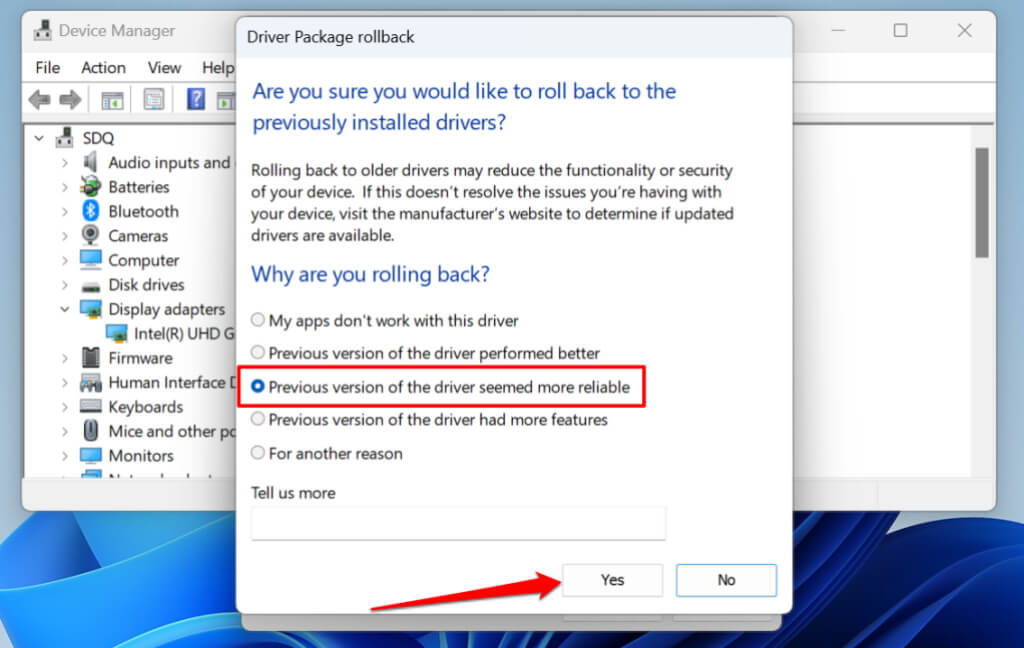 - Choose a reason you’re rolling back the driver and select Yes to downgrade to an older driver.