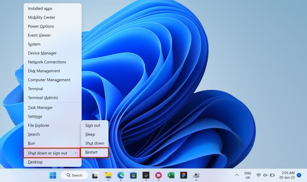 - Exit Safe Mode and boot your laptop into normal mode after the driver update. Press the Windows key + X, select Shut down or sign out, and choose Restart.