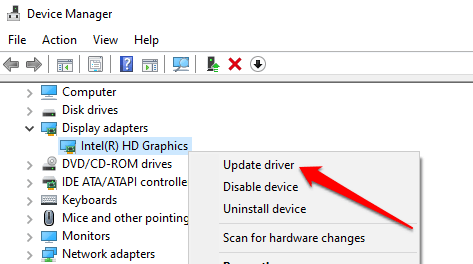 Expand the Display adapters section, right-click the graphics driver, and select Update driver.