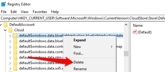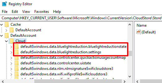 On the left sidebar, locate and delete these two subfolders: $$windows.data.bluelightreduction.bluelightreductionstate and $$windows.data.bluelightreduction.settings.