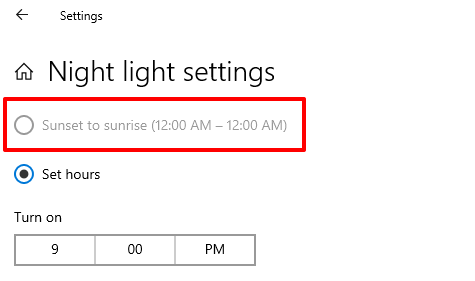 Return to the Night Light settings menu and check if you can use the “Sunrise to sunset” schedule.