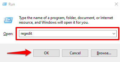 Launch the Windows Run box (Windows key + R), type regedit in the dialog box, and click OK.