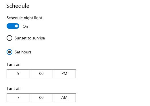 Choosing Windows’ preset “Sunset to sunrise” schedule means Night Light will come on by 7:30 PM every day and go off 6:30 AM in the morning. If you choose to set your own custom hours, make sure you enter the accurate time in the provided boxes.