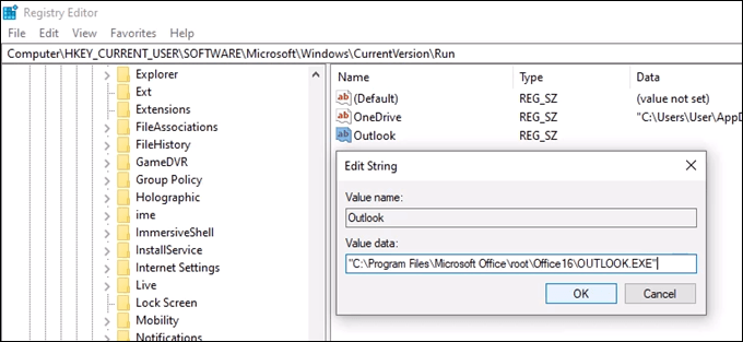 A bit more drastic approach is to enter the app directly into the registry key that controls which programs run on startup. Remember to back up the registry first! We’ll use Outlook as an example for this tip.