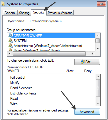 Next click on the **Security **tab and then click on the Advanced button at the bottom: