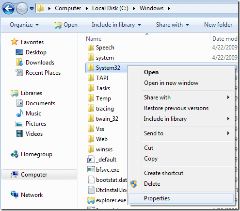 Click OK until you have closed all properties windows and are back to the Windows Explorer screen. Then right-click on the folder or file again and choose Properties again.