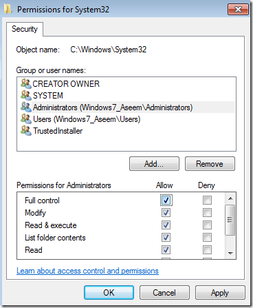Since I had changed the current owner to Administrators, I clicked on Administrators here and then clicked on the check box next to** Full Control**. When you do that, all the other boxes get checked too.