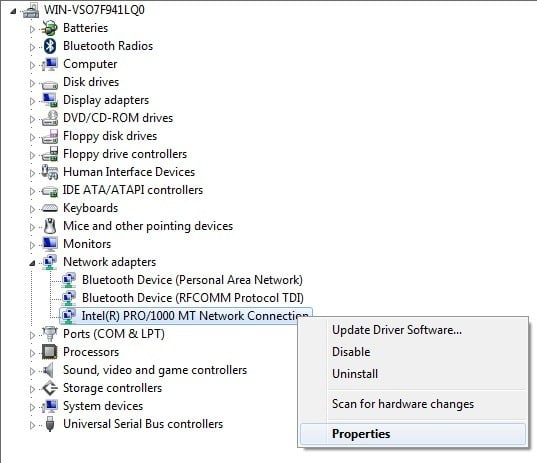 To do this, click on Start and type in Device Manager. Open Device Manager and then right-click on a piece of hardware, such as the network card and click on Properties.