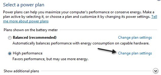 Click on Start and type in Power Options. This opens the power options dialog. Click on Change plan settings next to the active power plan.