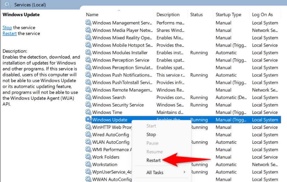 - Right-click the Windows Update service and choose Restart.