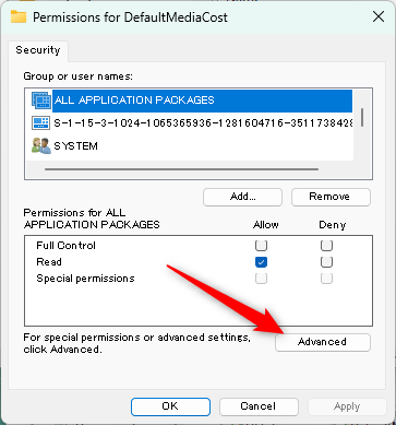 - In the Permissions for DefaultMediaCost window, click Advanced.