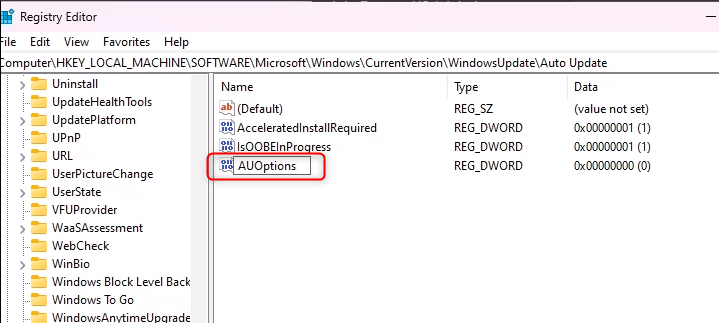 - Navigate to this file path in the Registry Editor: HKEY_LOCAL_MACHINESOFTWAREMicrosoftWindowsCurrentVersionWindowsUpdateAuto Update