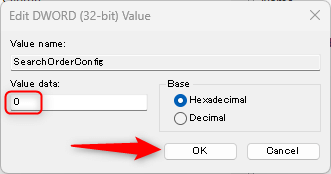 - Double-click the SearchOrderConfig value and edit its Value data to 0. Click OK.