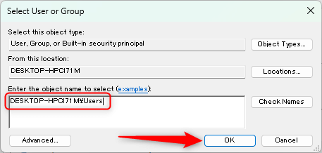 - Enter the user’s path in the text box. In our case, that would be DESKTOP-HPCI71MUsers. You can find this info next to Users in the previous step. After you enter the name, click OK.