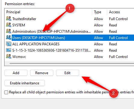 - Now that the Users is the owner, select Users from the Permission entries list and then click Edit.