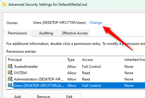 - Now we need to change the Owner. By default, this is TrustedInstaller. We need to change the owner to Users. Click Change.