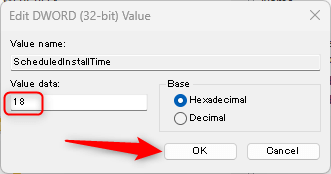 - Double-click ScheduledInstallTime and set the Value data to 1 through 24. The value represents the hour of the day in 24-hour format. Click OK.