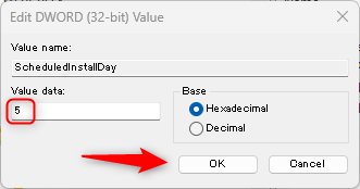 - Double-click ScheduledInstallDay and set the Value data to 1 through 7. 1 represents Sunday, 2 represents Monday, 3 represents Tuesday, and so on. Click OK.